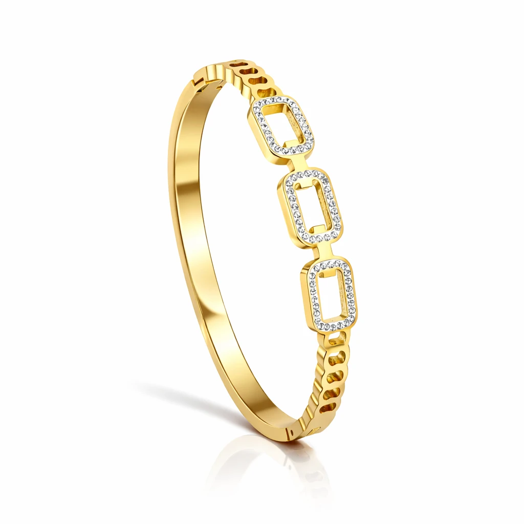 Još jedan izvanredan komad iz naše ponude je moderna narukvica od čelika s pozlatom i bijelim kamenom u elegantnom stilu. Precizno izrađena, ova narukvica spaja savremeni dizajn sa klasičnim linijama. Bijeli kamen reflektira svjetlost na suptilan, ali efektan način, dok pozlata pruža toplinu i bogat izgled. Bilo da se nosi samostalno ili u kombinaciji s drugim komadima nakita, ova narukvica će zasigurno privući pažnju i nadopuniti tvoj stil.